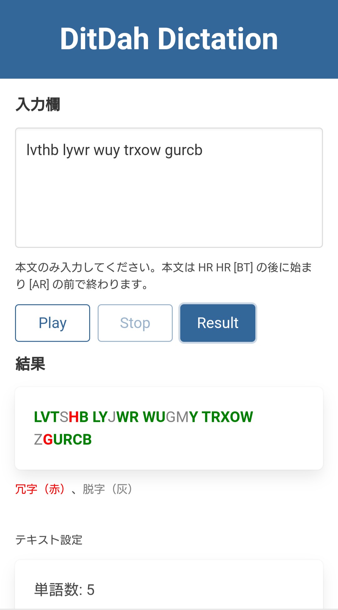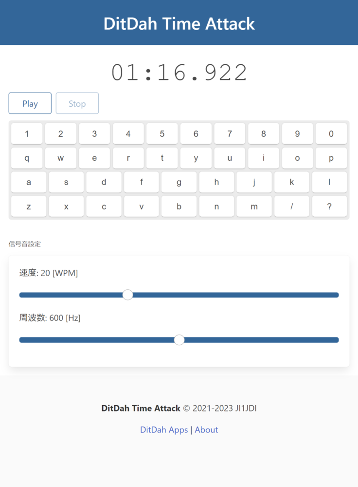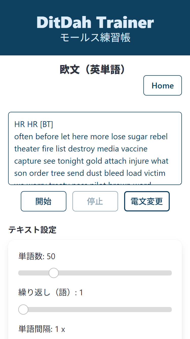 入力されたテキストのモールス符号を繰り返し再生します。苦手な文字、単語、フレーズの符号を繰り返し聞くことができます。